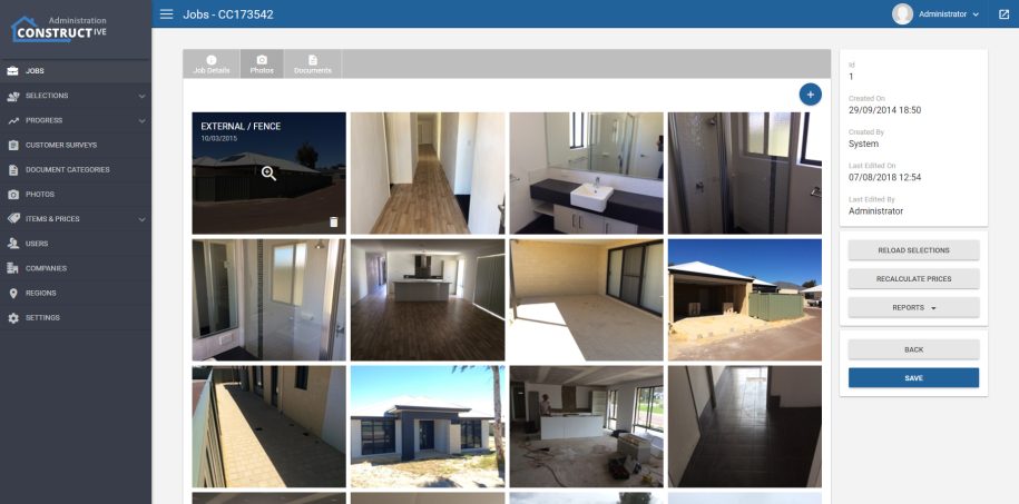 The photos page shows all the photos visible to the client in the customer portal. It gives you three important controls: upload new photos, delete photos and edit the description of photos. For most of you the photos come direct from a source system, but if you are uploading directly to Constructive this gives you far more control.